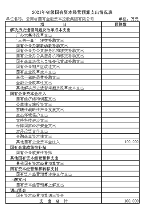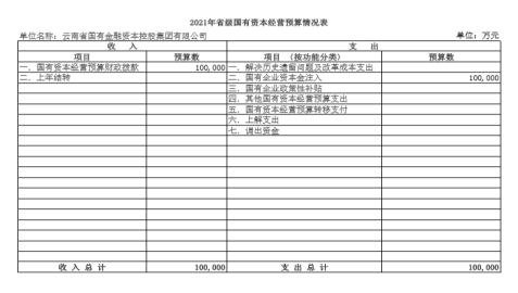根(gen)據《云南省財政廳(ting)關于批(pi)復云南省國(guo)有金融資本(ben)控股集團有限(xian)公司2021年(nian)省級(ji)國有資本經(jing)營預(yu)算的通(tong)知》(云財(cai)金〔2021〕18號(hao))要求,現(xian)將我公司2021年(nian)國有資本經(jing)營預(yu)算情況公示如下: