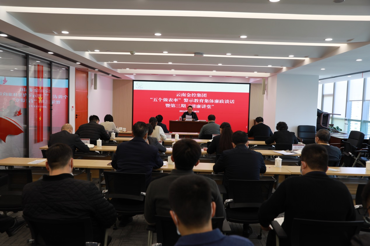 ? 云南(nan)金控集(ji)(ji)團(tuan)黨(dang)委認真貫徹落實省(sheng)委“五個(ge)作(zuo)(zuo)(zuo)表率(lv)(lv)(lv)”專題學習教育工作(zuo)(zuo)(zuo)要求,把開展(zhan)以案促(cu)改警示教育和集(ji)(ji)體(ti)廉政(zheng)談話作(zuo)(zuo)(zuo)為落實“五個(ge)作(zuo)(zuo)(zuo)表率(lv)(lv)(lv)”專題學習教育的具體(ti)行動和重要抓手,持續構建云南(nan)金控風清氣正(zheng)的政(zheng)治(zhi)生態。2021年12月28日(ri),集(ji)(ji)團(tuan)黨(dang)委組(zu)織集(ji)(ji)團(tuan)領導班子成(cheng)員、集(ji)(ji)團(tuan)中層管(guan)理人員開展(zhan)“五個(ge)作(zuo)(zuo)(zuo)表率(lv)(lv)(lv)”警示教育集(ji)(ji)體(ti)廉政(zheng)談話暨(ji)第三期“清廉講(jiang)堂”活動。