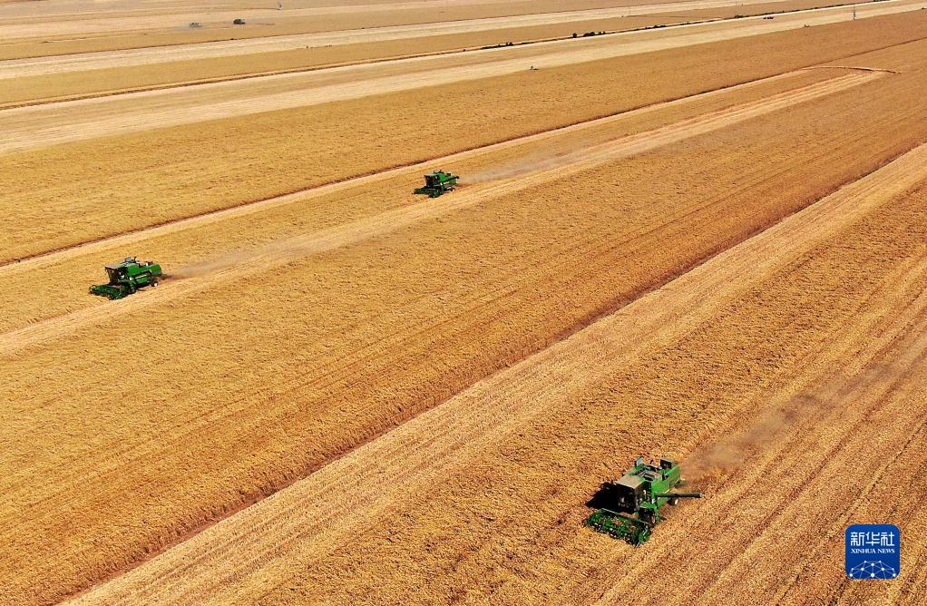 ?在河南省黃泛區農(nong)(nong)場九(jiu)分場的麥田里,農(nong)(nong)機(ji)(ji)手操作收割機(ji)(ji)收獲小麥(無人機(ji)(ji)照片,2021年6月6日攝)。新華社記者 李安 攝