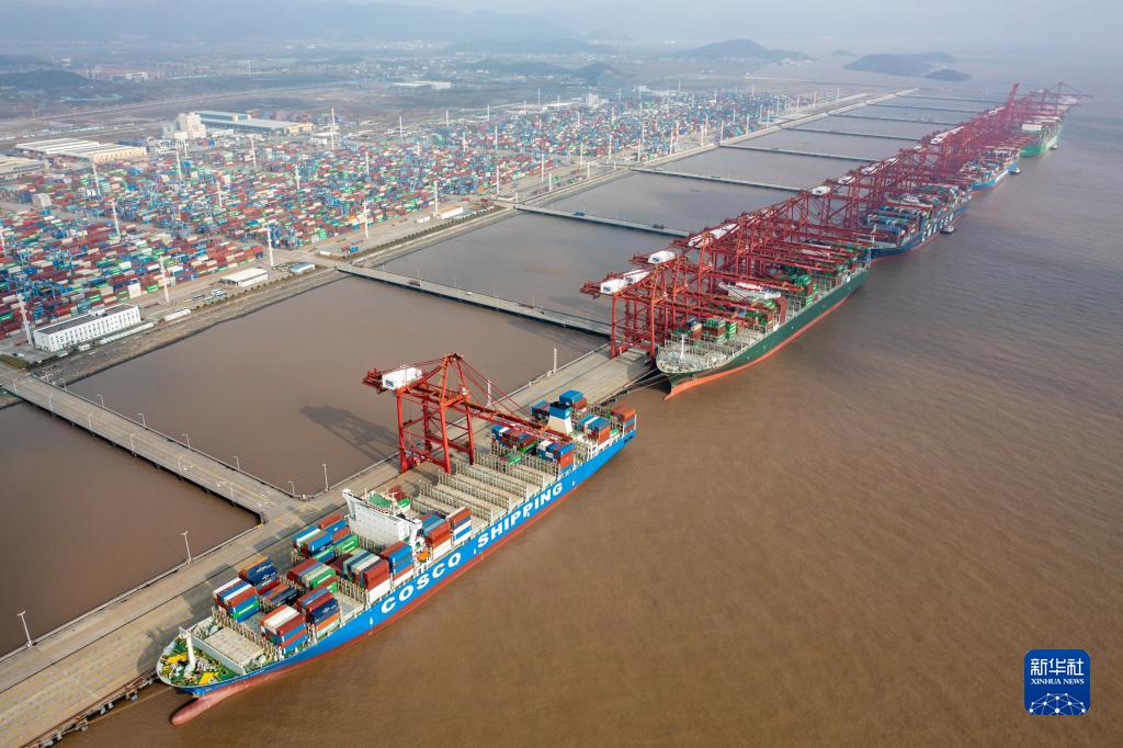 ?浙江寧(ning)波舟山港梅山港區集裝箱碼(ma)頭一派(pai)繁忙景象(xiang)(2021年12月17日攝(she),無(wu)人(ren)機照(zhao)片)。新華社發(蔣(jiang)曉東 攝(she))