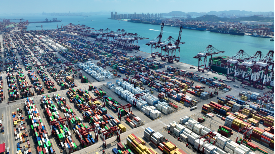 青(qing)島(dao)海關數據顯示(shi),今年1月(yue)(yue)至(zhi)5月(yue)(yue),青(qing)島(dao)直達金磚國家(jia)的航線(xian)共完成箱(xiang)量(liang)83萬標箱(xiang),同比(bi)增長12%,其中出口量(liang)增長26.1%。圖為(wei)繁忙的山東(dong)港口青(qing)島(dao)港前(qian)灣港區(qu),集裝(zhuang)箱(xiang)貨輪在裝(zhuang)卸集裝(zhuang)箱(xiang)(6月(yue)(yue)15日攝(she),無人機(ji)照片)。新華社記(ji)者 李(li)紫恒 /攝(she)