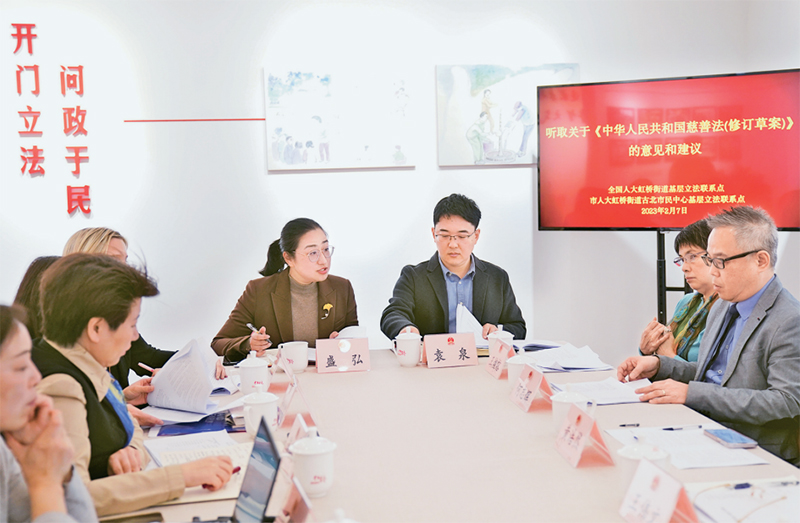 ?圖為2023年2月7日,在上海市長寧區虹橋街道基層立法聯系點召開的征詢會上,工作人員聽取相關人士對《中華人民共和國慈善法(修訂草案)》的意見和建議。新華社記者 劉穎/攝