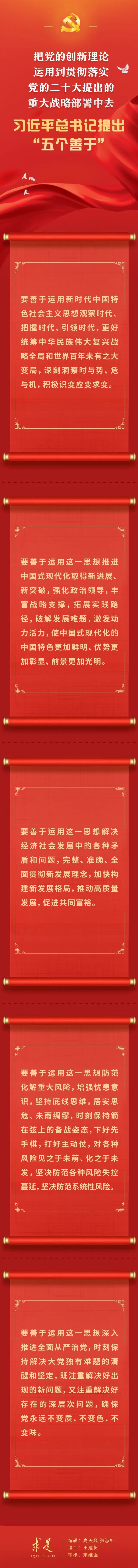 如何把黨的(de)(de)創新理論運用到(dao)貫徹落(luo)實(shi)黨的(de)(de)二(er)十大提(ti)出的(de)(de)重大戰略部署中去?在(zai)2023年第(di)10期《求是》雜志刊發(fa)的(de)(de)習(xi)近平(ping)總(zong)書記重要文章《在(zai)二(er)十屆中央政(zheng)治(zhi)局第(di)四(si)次集體學習(xi)時的(de)(de)講話》中,總(zong)書記提(ti)出“五個善于”的(de)(de)明確要求。