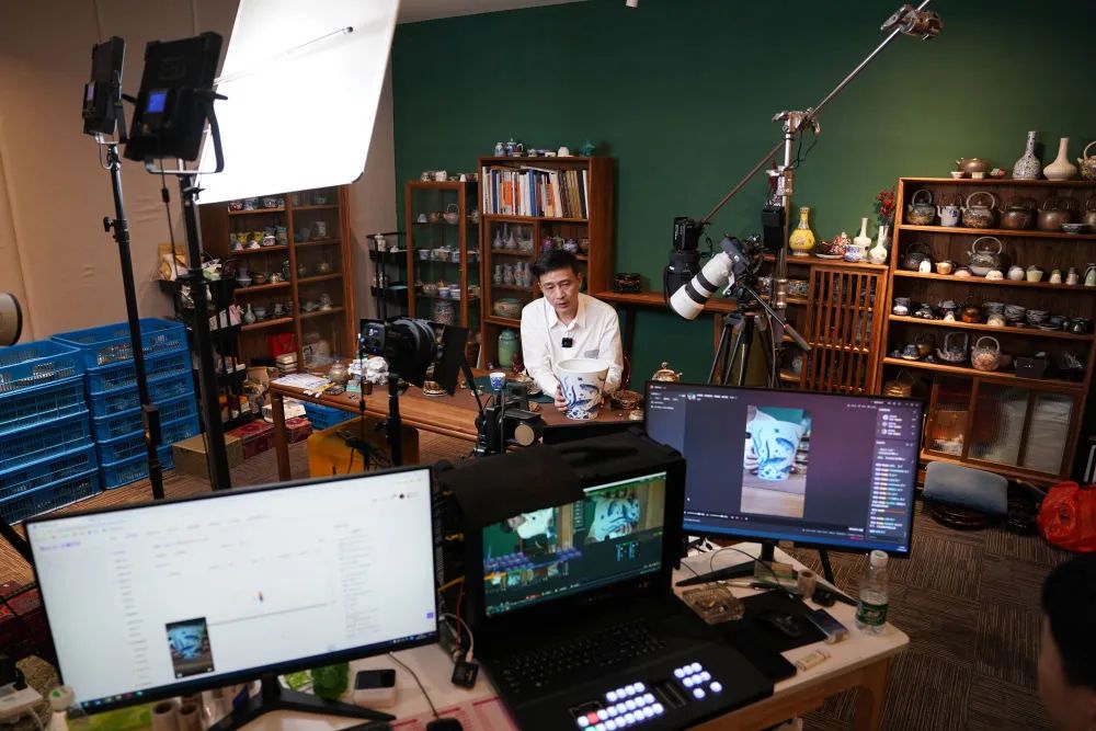 在(zai)江(jiang)西景德鎮陶(tao)溪川(chuan)文創街區的(de)直播(bo)基地(di)里,工作人員通過網(wang)絡(luo)直播(bo)推介陶(tao)瓷(ci)產品(pin)(2023年2月22日(ri)攝)。新華社記者 周密 攝