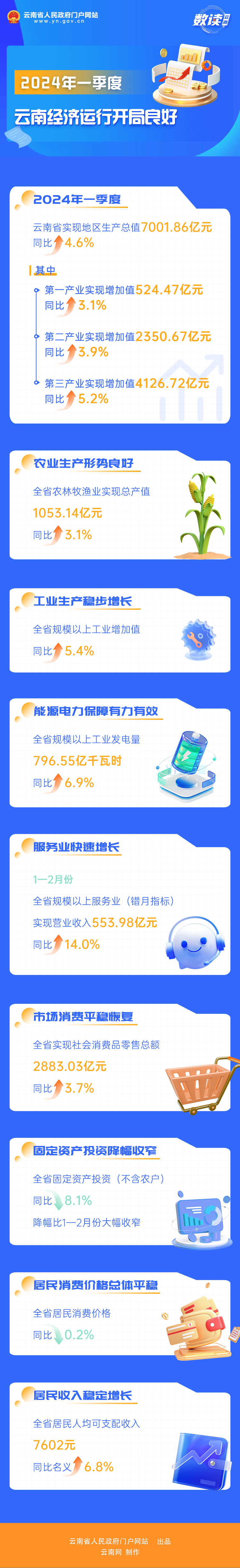 2024年一季度,云南堅持穩(wen)中求進(jin)(jin)工作總基調,錨定(ding)“3815”戰略發展目標,持續(xu)壯(zhuang)大(da)“三大(da)經(jing)濟(ji)”,加快推進(jin)(jin)市場化(hua)(hua)(hua)、產業化(hua)(hua)(hua)、法治(zhi)化(hua)(hua)(hua)、生(sheng)態化(hua)(hua)(hua)、數(shu)字(zi)化(hua)(hua)(hua)進(jin)(jin)程,著力轉(zhuan)方式、調結構(gou)、提質量(liang)、增(zeng)效(xiao)(xiao)益,推動經(jing)濟(ji)穩(wen)進(jin)(jin)提質政策效(xiao)(xiao)應逐(zhu)步(bu)顯(xian)現,生(sheng)產穩(wen)中有進(jin)(jin)、需求逐(zhu)步(bu)企穩(wen)、就(jiu)業物(wu)價總體穩(wen)定(ding)、居民收入穩(wen)步(bu)增(zeng)長,積極因(yin)素不斷積累(lei),發展質量(liang)穩(wen)步(bu)提升(sheng),經(jing)濟(ji)運行(xing)開局良好(hao)。