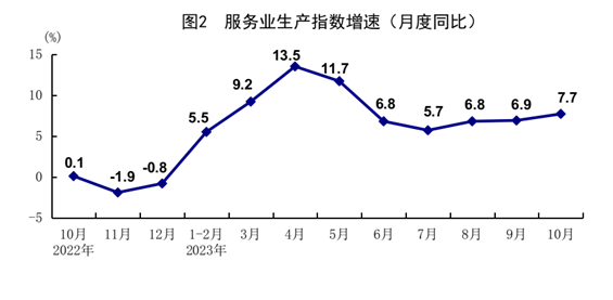 10月(yue)(yue)份(fen),全(quan)國(guo)服(fu)(fu)務(wu)業(ye)(ye)生產(chan)指(zhi)(zhi)(zhi)數(shu)(shu)同(tong)(tong)(tong)比(bi)增(zeng)長(chang)7.7%,比(bi)上月(yue)(yue)加快(kuai)0.8個百分(fen)點。分(fen)行業(ye)(ye)看,住宿和餐飲(yin)業(ye)(ye),交通運輸(shu)、倉儲(chu)和郵政業(ye)(ye),信息傳(chuan)輸(shu)、軟件和信息技術服(fu)(fu)務(wu)業(ye)(ye),批發和零售業(ye)(ye),金融業(ye)(ye)生產(chan)指(zhi)(zhi)(zhi)數(shu)(shu)同(tong)(tong)(tong)比(bi)分(fen)別增(zeng)長(chang)21.3%、13.2%、10.9%、10.0%、7.8%。1-10月(yue)(yue)份(fen),全(quan)國(guo)服(fu)(fu)務(wu)業(ye)(ye)生產(chan)指(zhi)(zhi)(zhi)數(shu)(shu)同(tong)(tong)(tong)比(bi)增(zeng)長(chang)7.9%。1-9月(yue)(yue)份(fen),規模以(yi)上服(fu)(fu)務(wu)業(ye)(ye)企業(ye)(ye)營業(ye)(ye)收入(ru)同(tong)(tong)(tong)比(bi)增(zeng)長(chang)7.1%。10月(yue)(yue)份(fen),服(fu)(fu)務(wu)業(ye)(ye)商務(wu)活(huo)動指(zhi)(zhi)(zhi)數(shu)(shu)為50.1%,業(ye)(ye)務(wu)活(huo)動預期指(zhi)(zhi)(zhi)數(shu)(shu)為57.5%,其中,鐵路運輸(shu)、航空運輸(shu)、郵政、電(dian)信廣播電(dian)視及衛(wei)星傳(chuan)輸(shu)服(fu)(fu)務(wu)等行業(ye)(ye)商務(wu)活(huo)動指(zhi)(zhi)(zhi)數(shu)(shu)位于60.0%以(yi)上高(gao)位景氣區間。