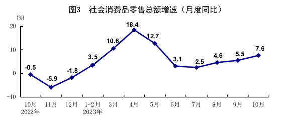 10月(yue)份,社會消費(fei)品(pin)零售(shou)(shou)(shou)(shou)總額(e)(e)(e)43333億(yi)(yi)(yi)元(yuan)(yuan),同(tong)(tong)(tong)比(bi)(bi)增(zeng)(zeng)(zeng)(zeng)(zeng)長(chang)7.6%,比(bi)(bi)上月(yue)加快(kuai)2.1個(ge)百(bai)分(fen)點;環比(bi)(bi)增(zeng)(zeng)(zeng)(zeng)(zeng)長(chang)0.07%。按經營單位(wei)所在地分(fen),城(cheng)鎮消費(fei)品(pin)零售(shou)(shou)(shou)(shou)額(e)(e)(e)37479億(yi)(yi)(yi)元(yuan)(yuan),同(tong)(tong)(tong)比(bi)(bi)增(zeng)(zeng)(zeng)(zeng)(zeng)長(chang)7.4%;鄉村(cun)消費(fei)品(pin)零售(shou)(shou)(shou)(shou)額(e)(e)(e)5854億(yi)(yi)(yi)元(yuan)(yuan),增(zeng)(zeng)(zeng)(zeng)(zeng)長(chang)8.9%。按消費(fei)類型(xing)分(fen),商品(pin)零售(shou)(shou)(shou)(shou)38533億(yi)(yi)(yi)元(yuan)(yuan),增(zeng)(zeng)(zeng)(zeng)(zeng)長(chang)6.5%;餐飲收(shou)入4800億(yi)(yi)(yi)元(yuan)(yuan),增(zeng)(zeng)(zeng)(zeng)(zeng)長(chang)17.1%。在限額(e)(e)(e)以上單位(wei)商品(pin)零售(shou)(shou)(shou)(shou)額(e)(e)(e)中,體育(yu)、娛樂(le)用品(pin)類,通訊器材類,汽車類,金銀珠寶類商品(pin)零售(shou)(shou)(shou)(shou)額(e)(e)(e)分(fen)別增(zeng)(zeng)(zeng)(zeng)(zeng)長(chang)25.7%、14.6%、11.4%、10.4%。1-10月(yue)份,社會消費(fei)品(pin)零售(shou)(shou)(shou)(shou)總額(e)(e)(e)385440億(yi)(yi)(yi)元(yuan)(yuan),同(tong)(tong)(tong)比(bi)(bi)增(zeng)(zeng)(zeng)(zeng)(zeng)長(chang)6.9%。全國網(wang)上零售(shou)(shou)(shou)(shou)額(e)(e)(e)122915億(yi)(yi)(yi)元(yuan)(yuan),同(tong)(tong)(tong)比(bi)(bi)增(zeng)(zeng)(zeng)(zeng)(zeng)長(chang)11.2%。其中,實物(wu)商品(pin)網(wang)上零售(shou)(shou)(shou)(shou)額(e)(e)(e)103010億(yi)(yi)(yi)元(yuan)(yuan),增(zeng)(zeng)(zeng)(zeng)(zeng)長(chang)8.4%,占社會消費(fei)品(pin)零售(shou)(shou)(shou)(shou)總額(e)(e)(e)的比(bi)(bi)重(zhong)為26.7%。1-10月(yue)份,服務零售(shou)(shou)(shou)(shou)額(e)(e)(e)同(tong)(tong)(tong)比(bi)(bi)增(zeng)(zeng)(zeng)(zeng)(zeng)長(chang)19.0%,比(bi)(bi)1-9月(yue)份加快(kuai)0.1個(ge)百(bai)分(fen)點。