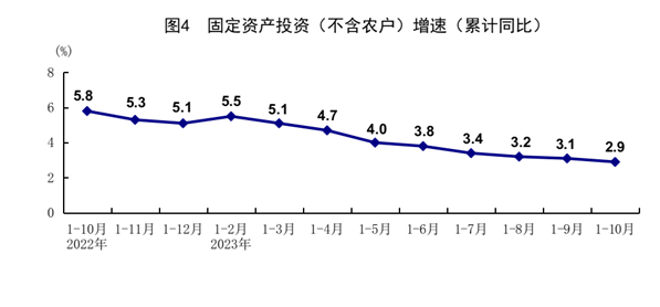 1-10月份(fen),全國固定資(zi)(zi)(zi)(zi)(zi)(zi)產投(tou)資(zi)(zi)(zi)(zi)(zi)(zi)(不(bu)含農(nong)戶)419409億元,同比(bi)(bi)增(zeng)(zeng)(zeng)(zeng)(zeng)(zeng)長(chang)(chang)2.9%,比(bi)(bi)1-9月份(fen)回落0.2個百(bai)分點。分領域看,基(ji)礎設(she)施(shi)投(tou)資(zi)(zi)(zi)(zi)(zi)(zi)同比(bi)(bi)增(zeng)(zeng)(zeng)(zeng)(zeng)(zeng)長(chang)(chang)5.9%,制(zhi)(zhi)造(zao)業(ye)(ye)(ye)(ye)(ye)(ye)投(tou)資(zi)(zi)(zi)(zi)(zi)(zi)增(zeng)(zeng)(zeng)(zeng)(zeng)(zeng)長(chang)(chang)6.2%,房(fang)地產開發投(tou)資(zi)(zi)(zi)(zi)(zi)(zi)下(xia)降(jiang)9.3%。全國商品房(fang)銷(xiao)(xiao)售(shou)面積92579萬平方(fang)米(mi),同比(bi)(bi)下(xia)降(jiang)7.8%;商品房(fang)銷(xiao)(xiao)售(shou)額(e)97161億元,下(xia)降(jiang)4.9%。分產業(ye)(ye)(ye)(ye)(ye)(ye)看,第一產業(ye)(ye)(ye)(ye)(ye)(ye)投(tou)資(zi)(zi)(zi)(zi)(zi)(zi)同比(bi)(bi)下(xia)降(jiang)1.3%,第二產業(ye)(ye)(ye)(ye)(ye)(ye)投(tou)資(zi)(zi)(zi)(zi)(zi)(zi)增(zeng)(zeng)(zeng)(zeng)(zeng)(zeng)長(chang)(chang)9.0%,第三產業(ye)(ye)(ye)(ye)(ye)(ye)投(tou)資(zi)(zi)(zi)(zi)(zi)(zi)增(zeng)(zeng)(zeng)(zeng)(zeng)(zeng)長(chang)(chang)0.4%。民間(jian)投(tou)資(zi)(zi)(zi)(zi)(zi)(zi)下(xia)降(jiang)0.5%,降(jiang)幅比(bi)(bi)1-9月份(fen)收窄0.1個百(bai)分點;扣除房(fang)地產開發投(tou)資(zi)(zi)(zi)(zi)(zi)(zi),民間(jian)投(tou)資(zi)(zi)(zi)(zi)(zi)(zi)同比(bi)(bi)增(zeng)(zeng)(zeng)(zeng)(zeng)(zeng)長(chang)(chang)9.1%。高技術(shu)產業(ye)(ye)(ye)(ye)(ye)(ye)投(tou)資(zi)(zi)(zi)(zi)(zi)(zi)同比(bi)(bi)增(zeng)(zeng)(zeng)(zeng)(zeng)(zeng)長(chang)(chang)11.1%,其(qi)中(zhong)高技術(shu)制(zhi)(zhi)造(zao)業(ye)(ye)(ye)(ye)(ye)(ye)和高技術(shu)服(fu)務(wu)業(ye)(ye)(ye)(ye)(ye)(ye)投(tou)資(zi)(zi)(zi)(zi)(zi)(zi)分別(bie)增(zeng)(zeng)(zeng)(zeng)(zeng)(zeng)長(chang)(chang)11.3%、10.5%。高技術(shu)制(zhi)(zhi)造(zao)業(ye)(ye)(ye)(ye)(ye)(ye)中(zhong),航空、航天(tian)器(qi)(qi)及設(she)備制(zhi)(zhi)造(zao)業(ye)(ye)(ye)(ye)(ye)(ye),醫療(liao)儀器(qi)(qi)設(she)備及儀器(qi)(qi)儀表制(zhi)(zhi)造(zao)業(ye)(ye)(ye)(ye)(ye)(ye)投(tou)資(zi)(zi)(zi)(zi)(zi)(zi)分別(bie)增(zeng)(zeng)(zeng)(zeng)(zeng)(zeng)長(chang)(chang)19.0%、16.7%;高技術(shu)服(fu)務(wu)業(ye)(ye)(ye)(ye)(ye)(ye)中(zhong),科技成果(guo)轉化服(fu)務(wu)業(ye)(ye)(ye)(ye)(ye)(ye)、專業(ye)(ye)(ye)(ye)(ye)(ye)技術(shu)服(fu)務(wu)業(ye)(ye)(ye)(ye)(ye)(ye)投(tou)資(zi)(zi)(zi)(zi)(zi)(zi)分別(bie)增(zeng)(zeng)(zeng)(zeng)(zeng)(zeng)長(chang)(chang)37.3%、29.1%。10月份(fen),固定資(zi)(zi)(zi)(zi)(zi)(zi)產投(tou)資(zi)(zi)(zi)(zi)(zi)(zi)(不(bu)含農(nong)戶)環比(bi)(bi)增(zeng)(zeng)(zeng)(zeng)(zeng)(zeng)長(chang)(chang)0.10%。