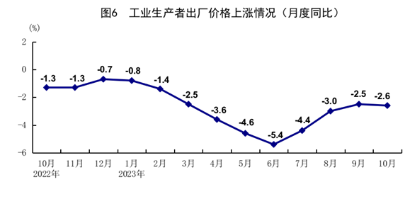 10月(yue)份,全(quan)國工(gong)業生(sheng)產者出(chu)廠(chang)價(jia)(jia)格(ge)同(tong)(tong)比(bi)下(xia)降2.6%,環比(bi)持(chi)平。全(quan)國工(gong)業生(sheng)產者購進價(jia)(jia)格(ge)同(tong)(tong)比(bi)下(xia)降3.7%,環比(bi)上漲0.2%。1-10月(yue)份,全(quan)國工(gong)業生(sheng)產者出(chu)廠(chang)價(jia)(jia)格(ge)和購進價(jia)(jia)格(ge)同(tong)(tong)比(bi)分(fen)別下(xia)降3.1%和3.6%。