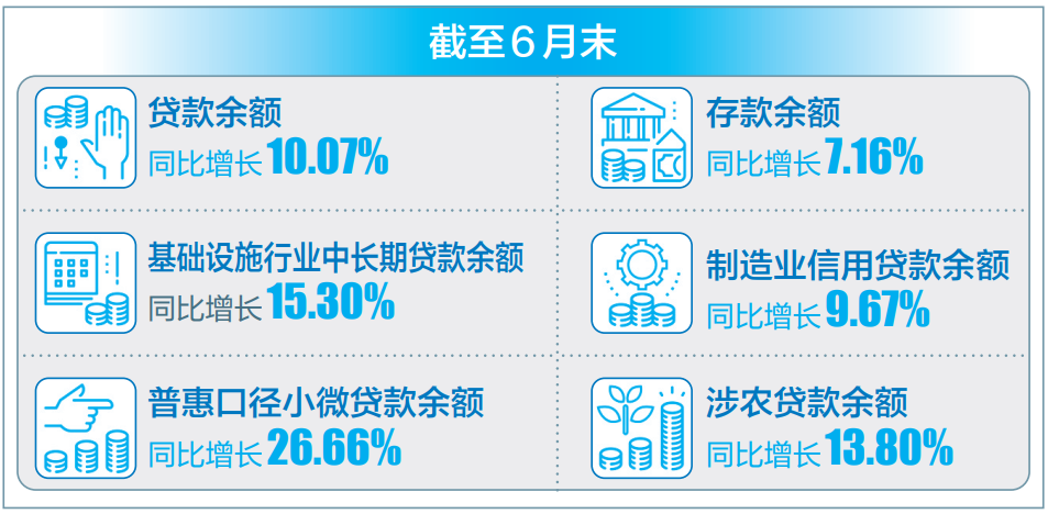 聚焦有效投資及重點領域,截至6月末,全省基礎設施行業中長期貸款余額1.06萬億元,同比增長15.30%;涉農貸款余額1.38萬億元,同比增長13.80%;綠色貸款余額4510.97億元,同比增長24.72%;制造業信用貸款余額846.39億元,同比增長9.67%,占制造業貸款的比重為47.98%。