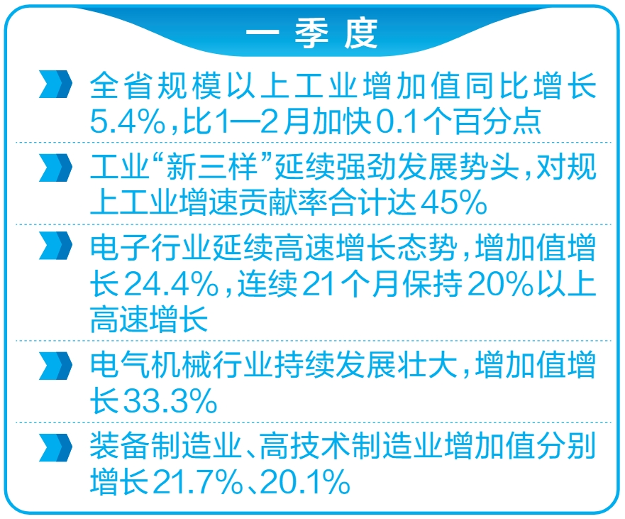 傳統(tong)行(xing)業支(zhi)撐有力,優(you)勢產(chan)(chan)業集聚成勢,新興產(chan)(chan)業高(gao)速(su)增(zeng)長(chang)。今年以來(lai),我省(sheng)大(da)抓(zhua)產(chan)(chan)業、主攻工(gong)業,緊緊扭住(zhu)“八個關(guan)鍵性(xing)抓(zhua)手”,聚力推進“四大(da)支(zhi)撐性(xing)工(gong)程”,加(jia)快(kuai)構建現代化工(gong)業體系(xi),工(gong)業經濟穩中有進,新動能(neng)加(jia)速(su)蓄積。統(tong)計數據顯示,一季度,全(quan)省(sheng)規模以上(shang)工(gong)業增(zeng)加(jia)值同比(bi)增(zeng)長(chang)5.4%,比(bi)1—2月加(jia)快(kuai)0.1個百分點。