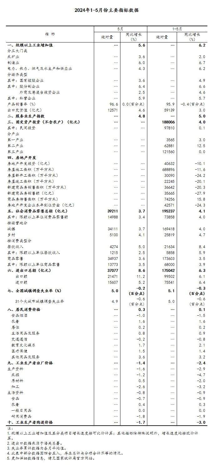 5月份,在以習近平同志為核心的黨中央堅強領導下,各地區各部門認真貫徹落實黨中央、國務院決策部署,堅持穩中求進工作總基調,完整、準確、全面貫徹新發展理念,加快構建新發展格局,扎實推動高質量發展,國民經濟延續回升向好態勢,生產穩定增長,需求持續恢復,就業物價總體穩定,國際收支平衡,轉型升級持續,運行總體平穩。