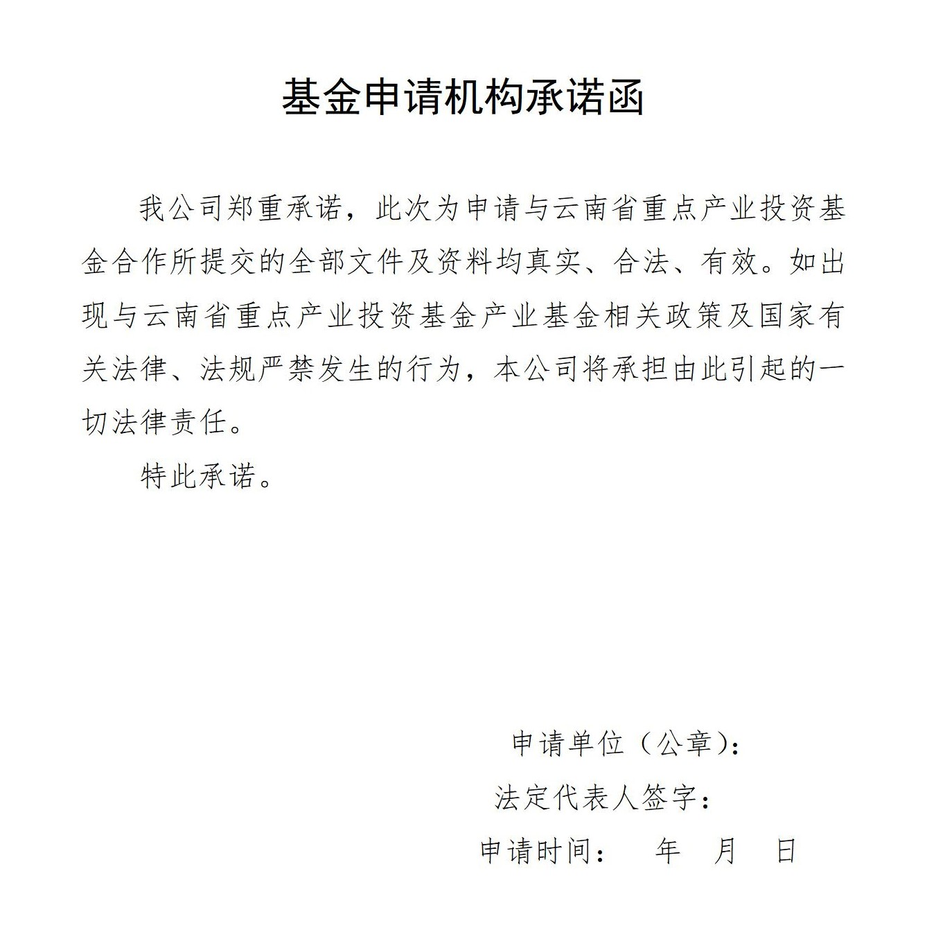 ? ? ??云(yun)(yun)(yun)南(nan)省(sheng)(sheng)重(zhong)點產(chan)業(ye)投資基(ji)金(jin)由各(ge)行業(ye)主管部(bu)門(men)、地(di)方(fang)政府(fu)根據省(sheng)(sheng)委省(sheng)(sheng)政府(fu)的決(jue)策部(bu)署,結(jie)合(he)各(ge)領域產(chan)業(ye)發展情況(kuang)編制產(chan)業(ye)基(ji)金(jin)設立方(fang)案(an)。產(chan)業(ye)基(ji)金(jin)申(shen)請(qing)(qing)(qing)機(ji)構(gou)按(an)照本(ben)申(shen)報(bao)(bao)指(zhi)南(nan)要求進行申(shen)報(bao)(bao)(模板見后)。產(chan)業(ye)基(ji)金(jin)申(shen)報(bao)(bao)采取遞交電(dian)子材料(liao)(liao)和紙質材料(liao)(liao)相(xiang)結(jie)合(he)的方(fang)式。請(qing)(qing)(qing)申(shen)請(qing)(qing)(qing)機(ji)構(gou)先(xian)將(jiang)包(bao)括蓋章掃(sao)描版及word版的電(dian)子材料(liao)(liao)發送至官方(fang)郵箱(xiang)(jjglb20212021@163.com),經(jing)省(sheng)(sheng)重(zhong)點基(ji)金(jin)管理(li)人(ren)初審認為無需(xu)(xu)補充(chong)的,再提交紙質材料(liao)(liao),紙質材料(liao)(liao)需(xu)(xu)要正本(ben)1本(ben)和副本(ben)2本(ben),正副本(ben)均(jun)需(xu)(xu)加蓋騎縫章。紙質版郵寄(ji)至云(yun)(yun)(yun)南(nan)省(sheng)(sheng)產(chan)業(ye)投資基(ji)金(jin)有限(xian)責任公(gong)司(郵寄(ji)地(di)址:云(yun)(yun)(yun)南(nan)省(sheng)(sheng)昆明市西山區人(ren)民(min)西路云(yun)(yun)(yun)投財(cai)富商業(ye)廣場B1棟19層)。申(shen)請(qing)(qing)(qing)機(ji)構(gou)對申(shen)請(qing)(qing)(qing)材料(liao)(liao)的合(he)法性、真(zhen)實性、有效性、一致性負完(wan)全責任。