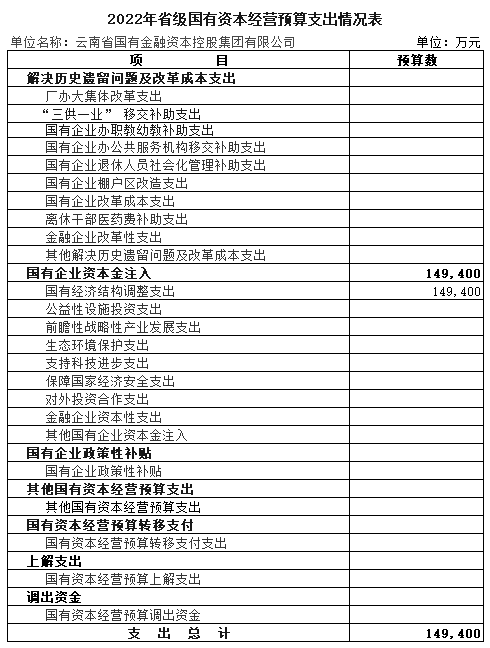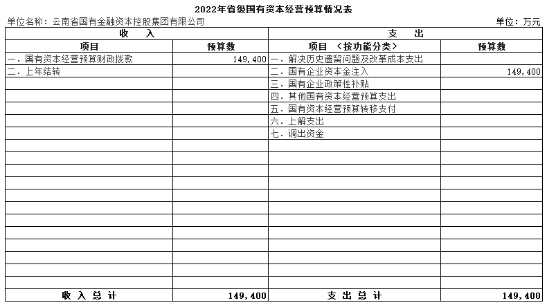 ?根據《云南省財政廳關于批復2022年省級國有資本經營預算的通知》(云財資〔2022〕1號)要求,現將我公司2022年國有資本經營預算情況公示如下: