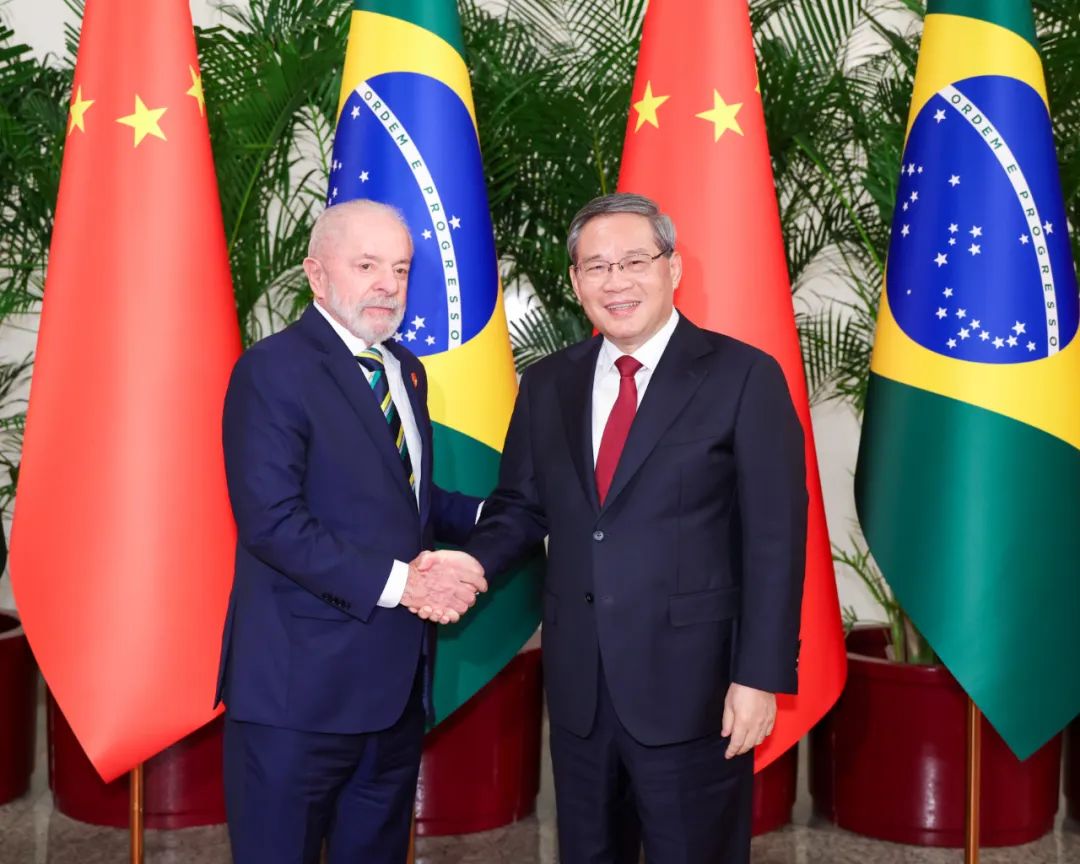 5月13日下午,國務院總理李強在北京人民大會堂會見來華進行國事訪問的巴西總統盧拉。