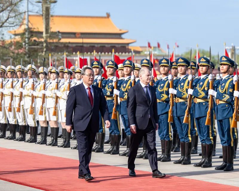 會談前,李強在人民大會堂東門外廣場為朔爾茨舉行歡迎儀式。