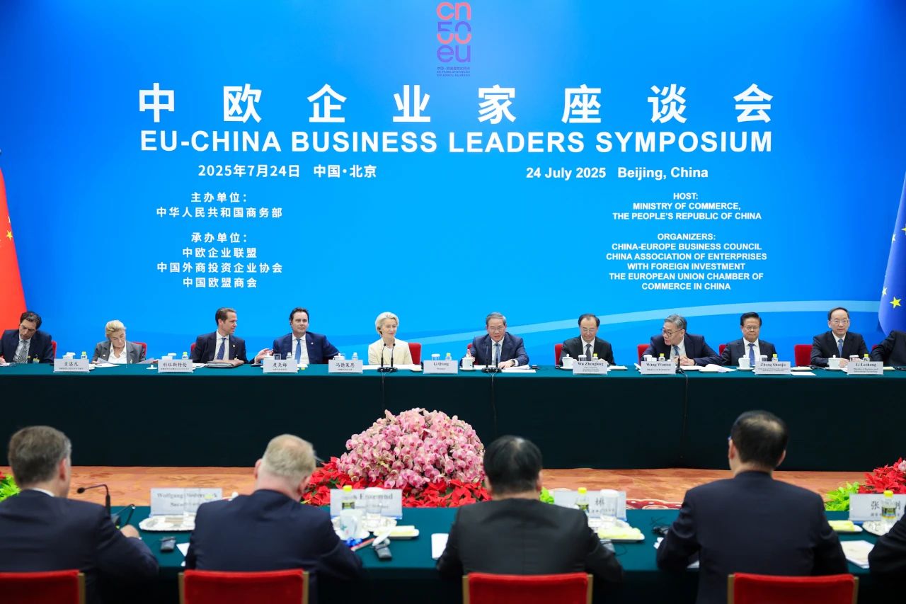 國務院總理李強7月24日下午在北京人民大會堂同歐盟委員會主席馮德萊恩共同出席中歐企業家座談會。近60位中歐商會和企業負責人出席。