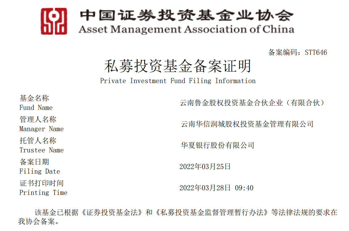 2022年3月,云(yun)南魯金(jin)(jin)股(gu)權投(tou)資基(ji)金(jin)(jin)合伙(huo)企業(有限合伙(huo))(下稱“魯金(jin)(jin)基(ji)金(jin)(jin)”)成功完成中國基(ji)金(jin)(jin)業協會(hui)備(bei)案,實現了(le)云(yun)南產投(tou)公司引入(ru)省外頭部國資投(tou)資機構管理基(ji)金(jin)(jin)落地云(yun)南“零”的突破(po)。