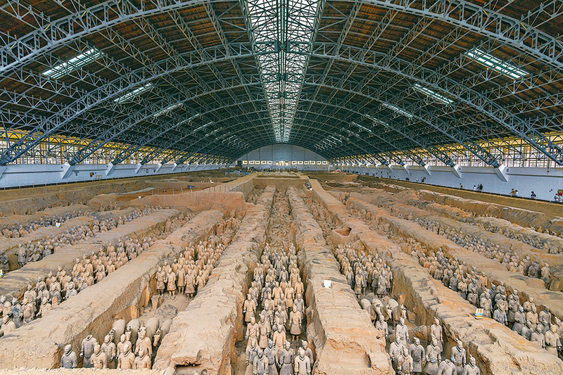 秦始皇陵是中國歷史上第一個多民族的中央集權國家的皇帝秦始皇于公元前246年至公元前208年營建的。作為秦始皇陵陪葬墓坑之一的兵馬俑坑于1974年被發現,被譽為“世界第八大奇跡”。圖為秦始皇兵馬俑博物館一號坑全景。人民圖片 丁俊豪/攝