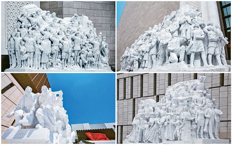 中國共產黨歷史展覽館西側廣場上矗立的《信仰》、《偉業》、《攻堅》、《追夢》四組大型雕塑,莊重巍然、充滿力量,講述著中國共產黨團結帶領全國各族人民艱苦奮斗、不懈奮斗的歷程。圖為四組大型雕塑拼版照片。 劉新武/攝
