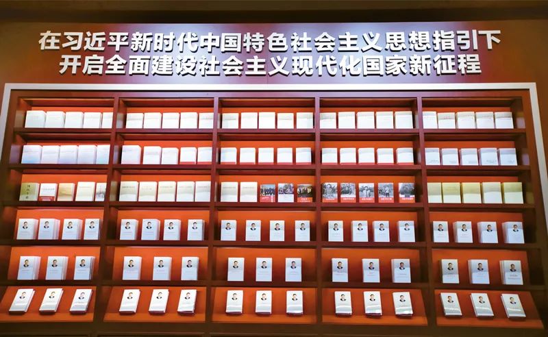 圖為中國共產黨歷史展覽館展出的習近平總書記的部分重要著作以及學習闡釋習近平新時代中國特色社會主義思想的部分重點圖書。劉新武/攝