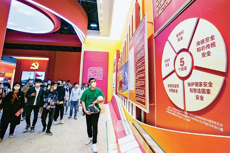 圖為2022年10月2日,觀眾在北京展覽館參觀“奮進新時代”主題成就展第九單元“全面踐行總體國家安全觀 開創新時代國家安全新局面”展廳。 劉新武/攝