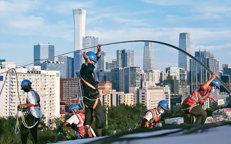 圖為2022年7月18日,在北京工人體育場改造復建工程的頂棚上,工人在太陽的余暉下作業。 工人日報記者 吳凡/攝