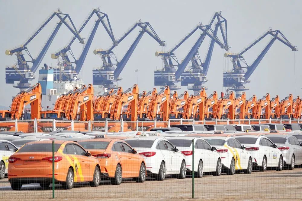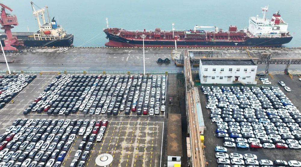 在江蘇連云港港口碼頭,一批國產小汽車在等待裝船出口海外(無人機照片,1月13日攝)。新華社發(耿玉和 攝)