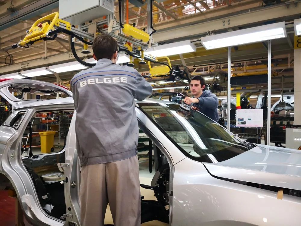 在白俄羅斯首都明斯克東北方向50公里處的白俄羅斯吉利全散件汽車制造廠總裝車間,工人在組裝車體(手機照片,2018年12月1日攝)。新華社記者 張若玄 攝