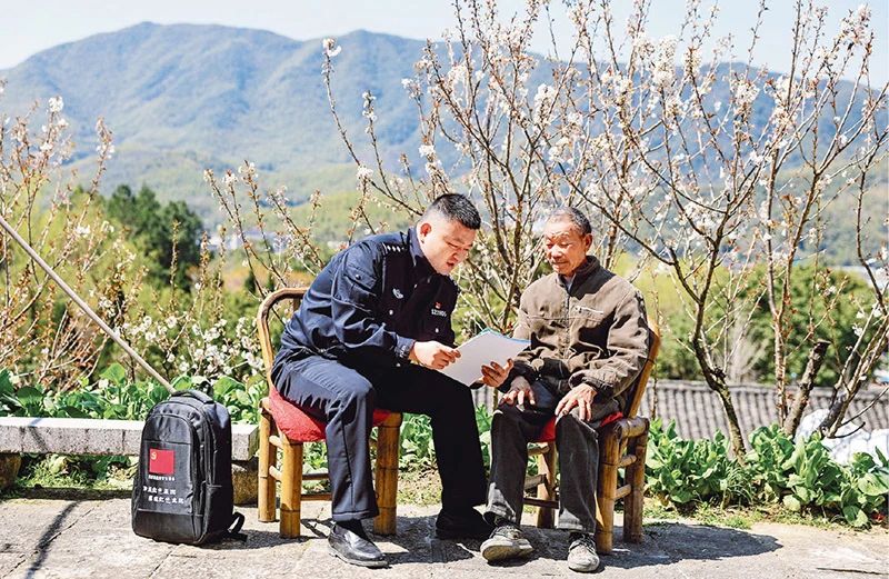 近年來,各地公安機關踐行新時代“楓橋經驗”,創新開展“背包警務”等工作模式,為基層群眾排憂解難,推動矛盾糾紛化解。圖為2025年3月21日,浙江省余姚市公安局梁弄派出所民警通過“背包警務”進村入戶,開展安全防范宣傳。新華社記者 江漢/攝