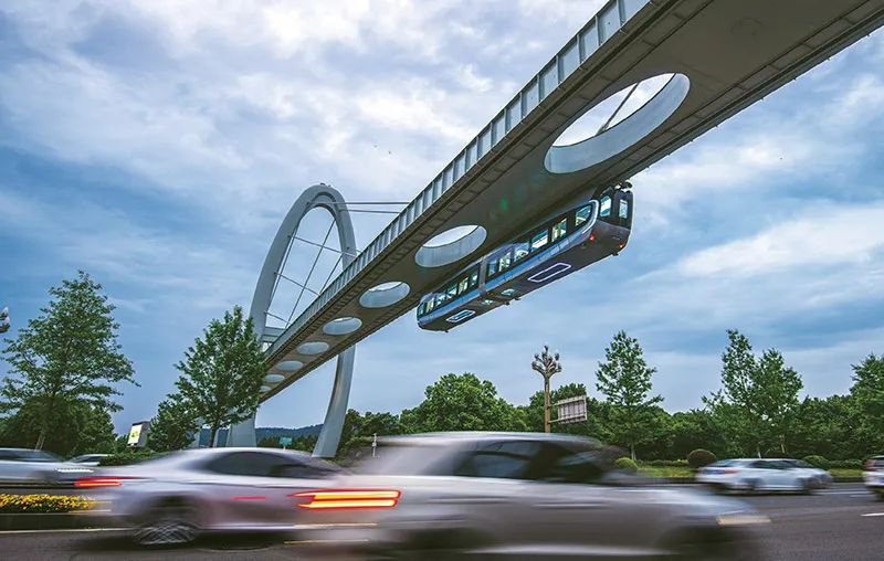 列車懸掛在軌道下方,從人們頭頂飛馳而過,這樣的科幻場景,最近在武漢東湖新技術開發區成了現實。圖為2023年5月9日,武漢“光谷光子號”空軌列車在綜合聯調和試運行中。 新華社記者 肖藝九/攝