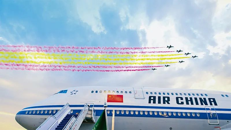 圖為2022年12月7日,國家主席習近平抵達沙特阿拉伯首都利雅得時,禮賓護衛機在空中拉出象征中國國旗的紅黃兩色彩帶。新華社記者 謝環馳/攝