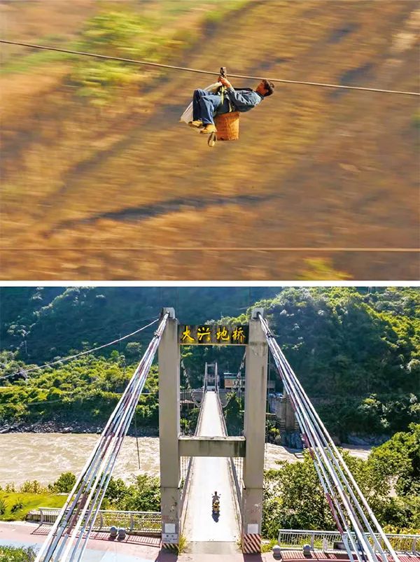 ?“過江靠溜索”曾是怒江兩岸群眾出行的重要方式。2013年,國家實施“溜索改橋”項目,幫助西部邊遠山區群眾結束溜索時代,怒江州怒江段上溜索被改造為各式跨江橋梁,完成了沿江人民“天塹變通途”的企盼。上圖為2013年2月2日,在云南省怒江州瀘水市六庫街道,一名居民背著背簍溜索過江(新華社記者 王長山/攝)。下圖為2022年9月13日,瀘水市居民騎摩托車通過大興地橋(無人機照片,新華社記者 江文耀/攝)。