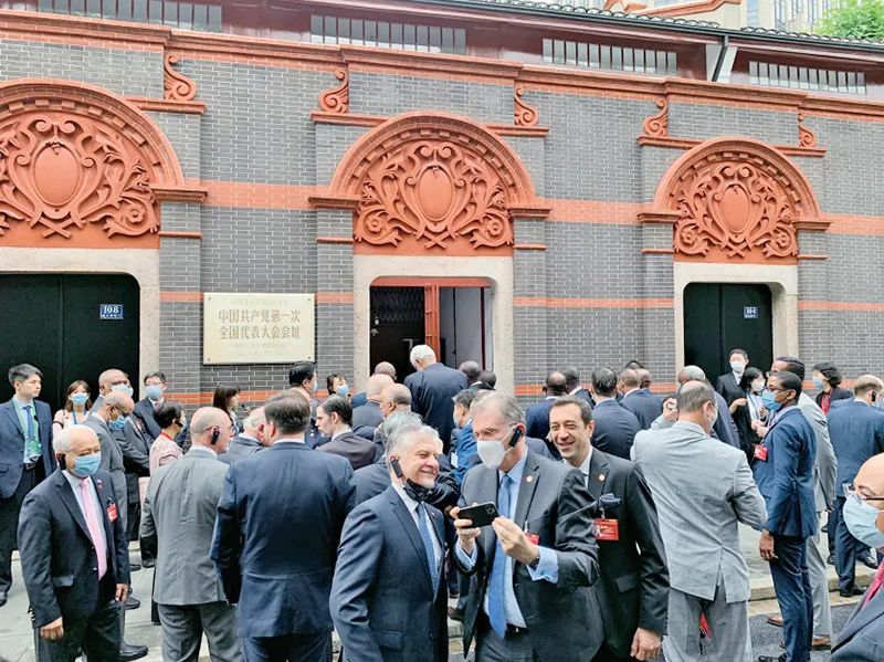 2021年6月16日,“中國共產黨的故事——習近平新時代中國特色社會主義思想在上海的實踐”特別對話會在上海舉行。近100個國家、126個政黨和友好組織的740多名代表通過視頻連線參加對話會,40多個國家駐華大使現場出席會議。圖為與會駐華使節參觀中共一大會址。 人民網 馬作鵬/攝