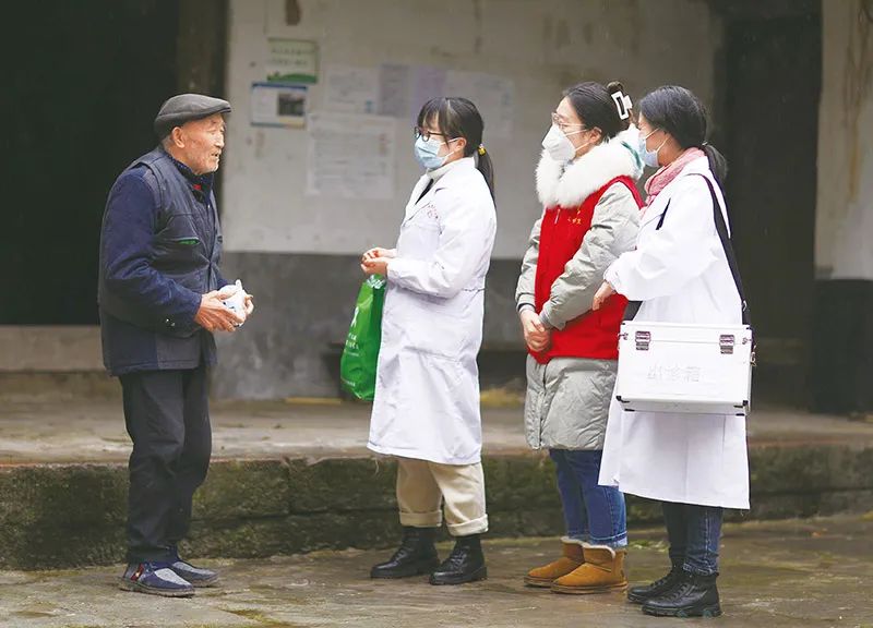 2022年12月28日,在貴州赤水市石堡鄉興農村,醫護人員和黨員志愿者為村民提供送藥上門服務,在新冠疫情防控進入轉段階段后,積極發揮好基層醫療第一道防線作用。 新華社發 王長育/攝