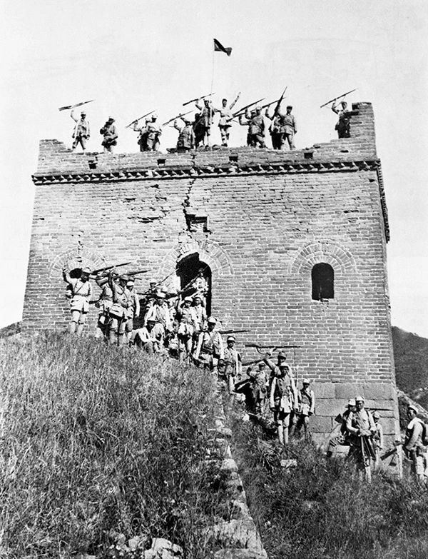圖為1940年八路軍在百團大戰中攻克淶源縣日軍據點東團堡后,戰士們在內長城烽火臺上歡呼勝利(資料照片)。 新華社發