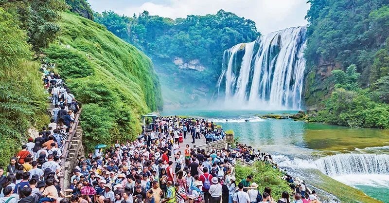 推動高質量發展,需要著力擴大國內需求,激發有潛能的消費。圖為2023年10月3日,游客在貴州省安順市黃果樹瀑布景區游玩。新華社發 陳熙/攝