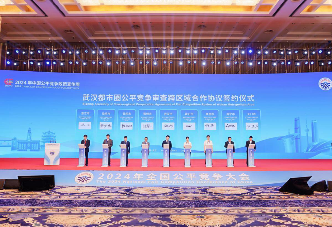 2024年9月10日至11日,由國家市場監督管理總局主辦的2024年全國公平競爭大會在湖北省武漢市舉行,大會主題為“統一大市場 公平競未來”。圖為9月11日,武漢、黃石、鄂州、孝感、黃岡、咸寧、天門、仙桃、潛江等9個城市代表,現場簽訂公平競爭審查跨區域合作協議。? ?湖北省市場監管局供圖