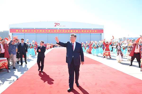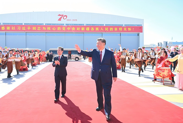 中共中央總書記、國家主席、中央軍委主席習近平在烏魯木齊出席新疆維吾爾自治區成立70周年慶祝活動后,9月25日中午乘專機返回北京。這是習近平在烏魯木齊天山國際機場向前來歡送的各族群眾揮手致意。新華社記者 謝環馳 攝