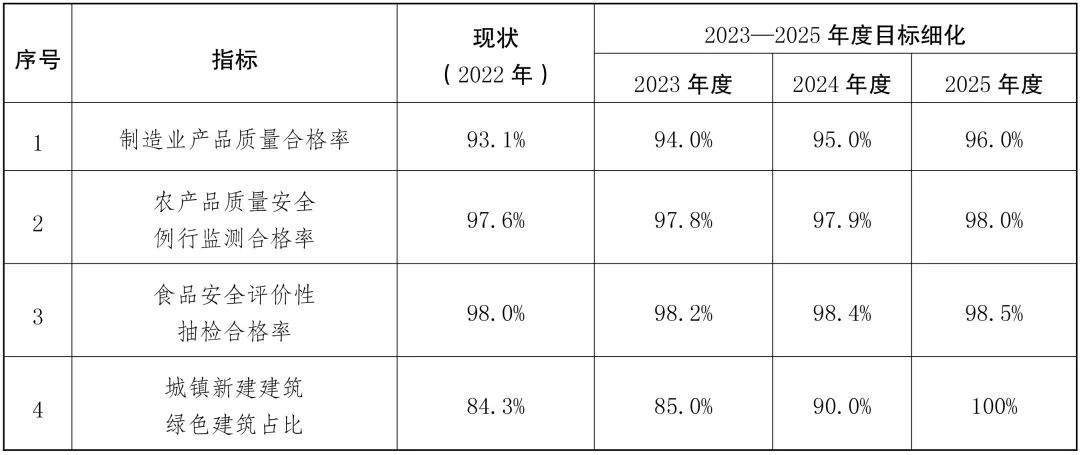 到2025年,新產品、新業態蓬勃發展,產品、工程、服務質量水平顯著改善,制造業產品質量合格率提高到96%,農產品質量安全例行監測合格率達到98%以上,食品安全評價性抽檢合格率保持在98.5%以上,工程質量抽查符合率不斷提高,城鎮新建建筑綠色建筑占比達到100%。