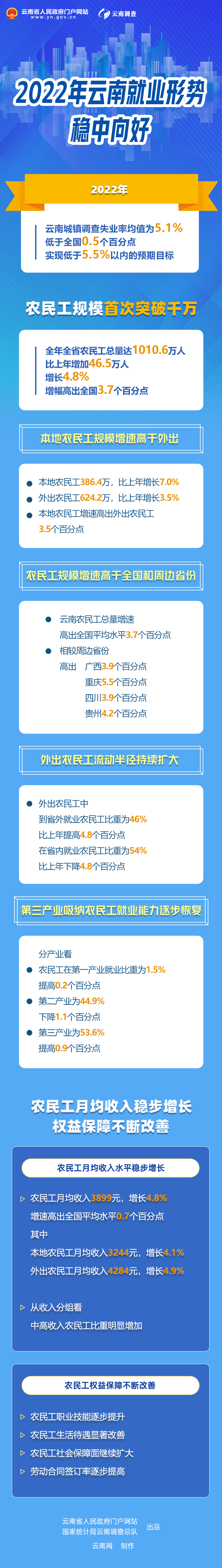 國家統計局云南調查總隊根據國家現行統計調查制度規定依法開展的相關調查結果顯示:2022年,云南城鎮調查失業率均值為5.1%,低于全國0.5個百分點,實現了低于5.5%以內的預期目標。全年全省農民工總量達到1010.6萬,比上年增加46.5萬人,增長4.8%,增幅高出全國3.7個百分點,實現了就業穩、民生穩。