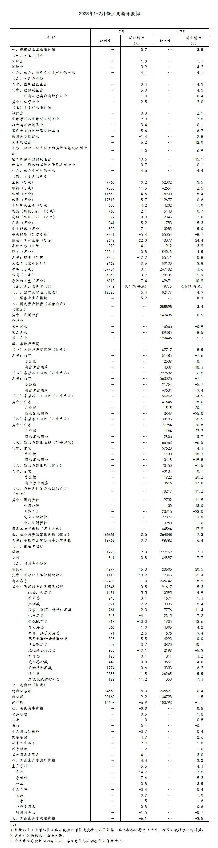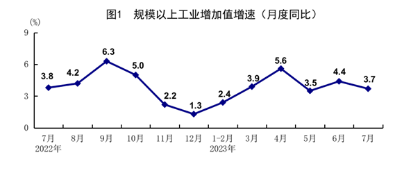 7月份,全國規模以上工業增加值同比增長3.7%,環比增長0.01%。分三大門類看,采礦業增加值同比增長1.3%,制造業增長3.9%,電力、熱力、燃氣及水生產和供應業增長4.1%。原材料制造業增加值同比增長8.8%,比上月加快2.0個百分點。分經濟類型看,國有控股企業增加值同比增長3.4%;股份制企業增長5.0%,外商及港澳臺商投資企業下降1.8%;私營企業增長2.5%。分產品看,太陽能電池、新能源汽車產品產量同比分別增長65.1%、24.9%。1-7月份,全國規模以上工業增加值同比增長3.8%。7月份,制造業采購經理指數為49.3%,企業生產經營活動預期指數為55.1%。