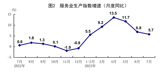 7月份,全國服務業生產指數同比增長5.7%。分行業看,住宿和餐飲業,信息傳輸、軟件和信息技術服務業,金融業,交通運輸、倉儲和郵政業生產指數同比分別增長20.0%、11.2%、7.6%、7.3%。1-7月份,全國服務業生產指數同比增長8.3%。1-6月份,規模以上服務業企業營業收入同比增長7.5%。7月份,服務業商務活動指數為51.5%,業務活動預期指數為58.7%,其中,航空運輸、郵政快遞、電信廣播電視及衛星傳輸服務、互聯網軟件及信息技術服務等行業商務活動指數位于60%以上高位景氣區間。