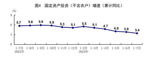1-7月份,全國固定資產投資(不含農戶)285898億元,同比增長3.4%。分領域看,基礎設施投資同比增長6.8%,制造業投資增長5.7%,房地產開發投資下降8.5%。全國商品房銷售面積66563萬平方米,同比下降6.5%;商品房銷售額70450億元,下降1.5%。分產業看,第一產業投資同比下降0.9%,第二產業投資增長8.5%,第三產業投資增長1.2%。民間投資下降0.5%。高技術產業投資同比增長11.5%,其中高技術制造業和高技術服務業投資分別增長11.5%、11.6%。高技術制造業中,醫療儀器設備及儀器儀表制造業、電子及通信設備制造業投資分別增長16.0%、13.9%;高技術服務業中,科技成果轉化服務業、專業技術服務業投資分別增長44.9%、23.8%。7月份,固定資產投資(不含農戶)環比下降0.02%。