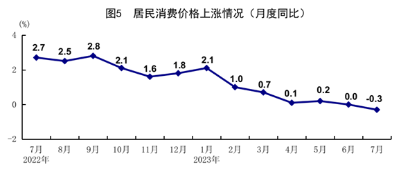 7月份,全國居民消費價格(CPI)同比下降0.3%,環比上漲0.2%。分類別看,食品煙酒價格同比下降0.5%,衣著價格上漲1.0%,居住價格上漲0.1%,生活用品及服務價格下降0.2%,交通通信價格下降4.7%,教育文化娛樂價格上漲2.4%,醫療保健價格上漲1.2%,其他用品及服務價格上漲4.1%。在食品煙酒價格中,豬肉價格下降26.0%,鮮菜價格下降1.5%,糧食價格上漲0.3%,鮮果價格上漲5.0%。扣除食品和能源價格后的核心CPI同比上漲0.8%,漲幅比上月擴大0.4個百分點。1-7月份,全國居民消費價格同比上漲0.5%。