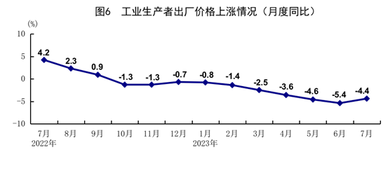7月份,全國工業生產者出廠價格同比下降4.4%,降幅比上月收窄1.0個百分點;環比下降0.2%。全國工業生產者購進價格同比下降6.1%,降幅比上月收窄0.4個百分點;環比下降0.5%。1-7月份,全國工業生產者出廠價格和購進價格同比分別下降3.2%和3.5%。