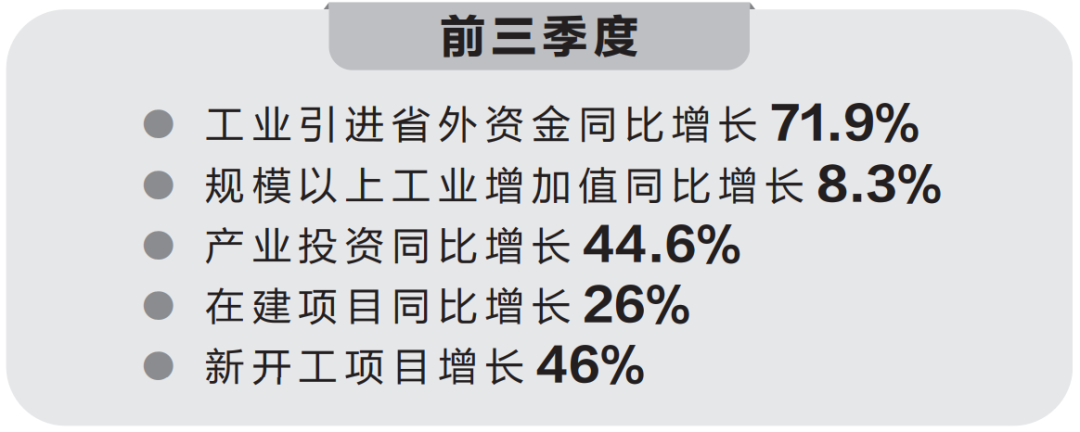 ?工業招大引強落地見效。全省上下圍繞優勢資源、開放通道、延鏈補鏈強鏈狠抓招商,先后引進正威集團、廈門鎢業、中國五冶等重點企業,一大批招商引資項目加快簽約落地,全產業鏈招商成效明顯。前三季度,全省引進省外到位資金同比增長24.2%,其中工業引資同比增長71.9%,占全部引資的33.6%。