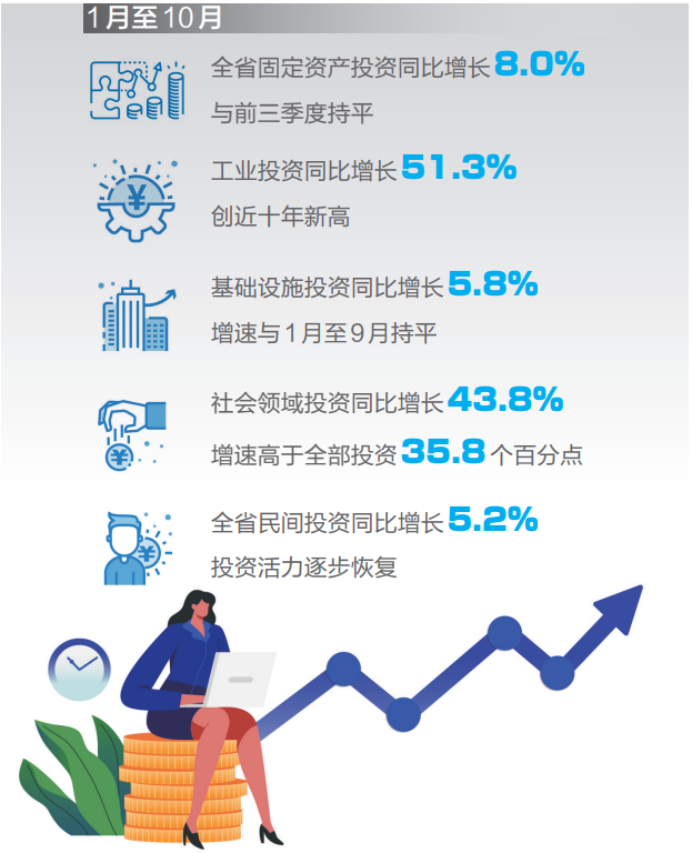 ?數據顯示,1月至10月,全省民間投資同比增長5.2%,比1月至9月提高0.2個百分點,增速連續4個月加快,投資活力逐步恢復。占全部投資的比重為43.9%,拉動全部投資增長2.3個百分點。其中,產業民間投資同比增長38.4%,比1月至9月提高0.9個百分點。