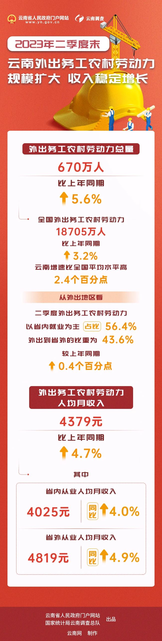 2023年二季度末,云南省外出務工農村勞動力人均月收入為4379元,同比增長4.7%。其中,省內從業人均月收入4025元,同比增長4.0%;省外從業人均月收入4819元,同比增長4.9%。