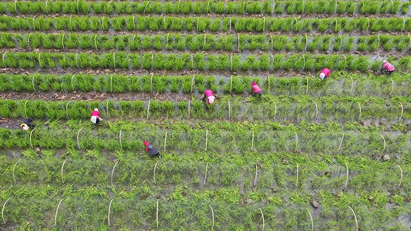 2023年2月23日,浙江省溫嶺市新河鎮農民進行茭白秧苗春季管理(無人機照片)。新華社發(周學軍 攝)